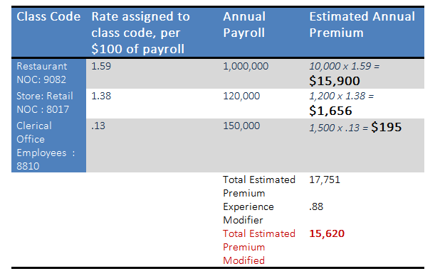Let’s assume The Fake Falafel has a friendly Experience Modification Factor of .88 due to their ongoing workplace safety efforts. The experience mod is the final piece of information needed to estimate the workers compensation premium paid by The Fake Falafel Diner.